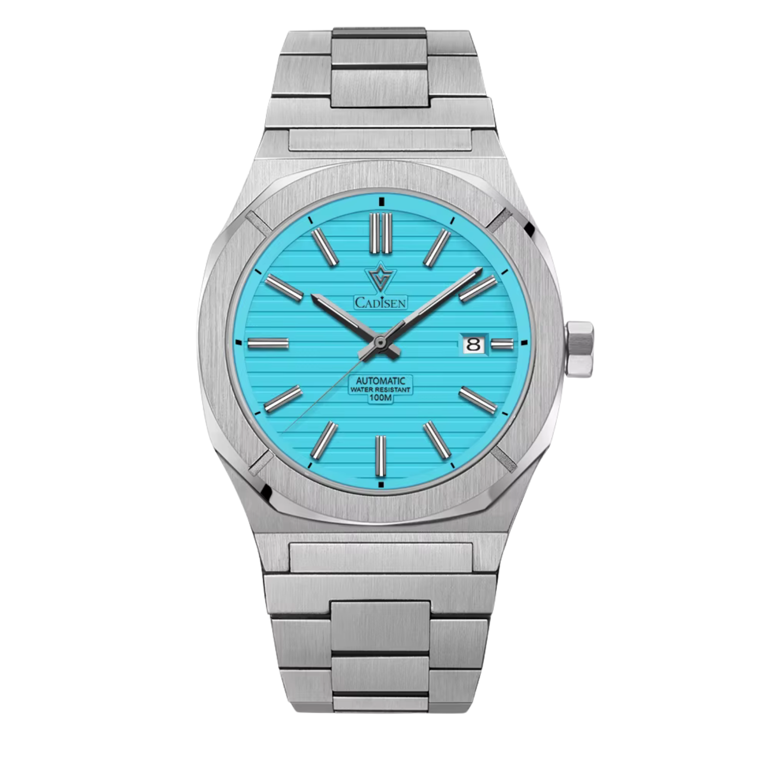 The Cadisen Automatic Watch with turquoise dial and stainless steel bracelet blends modern design with mechanical precision. Featuring an automatic movement, date display, and 100M water resistance, it’s ideal for men who want a bold, refined watch with everyday durability.